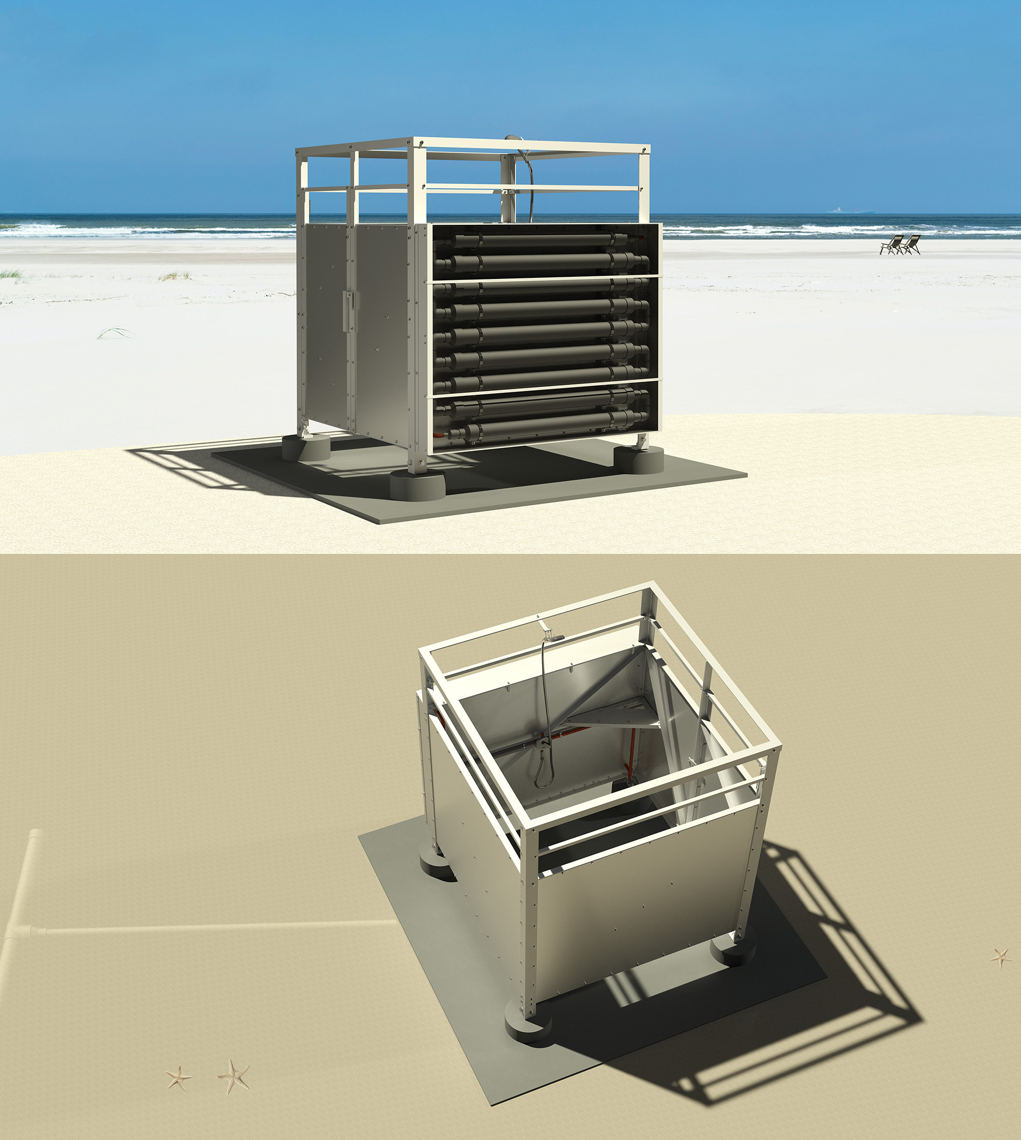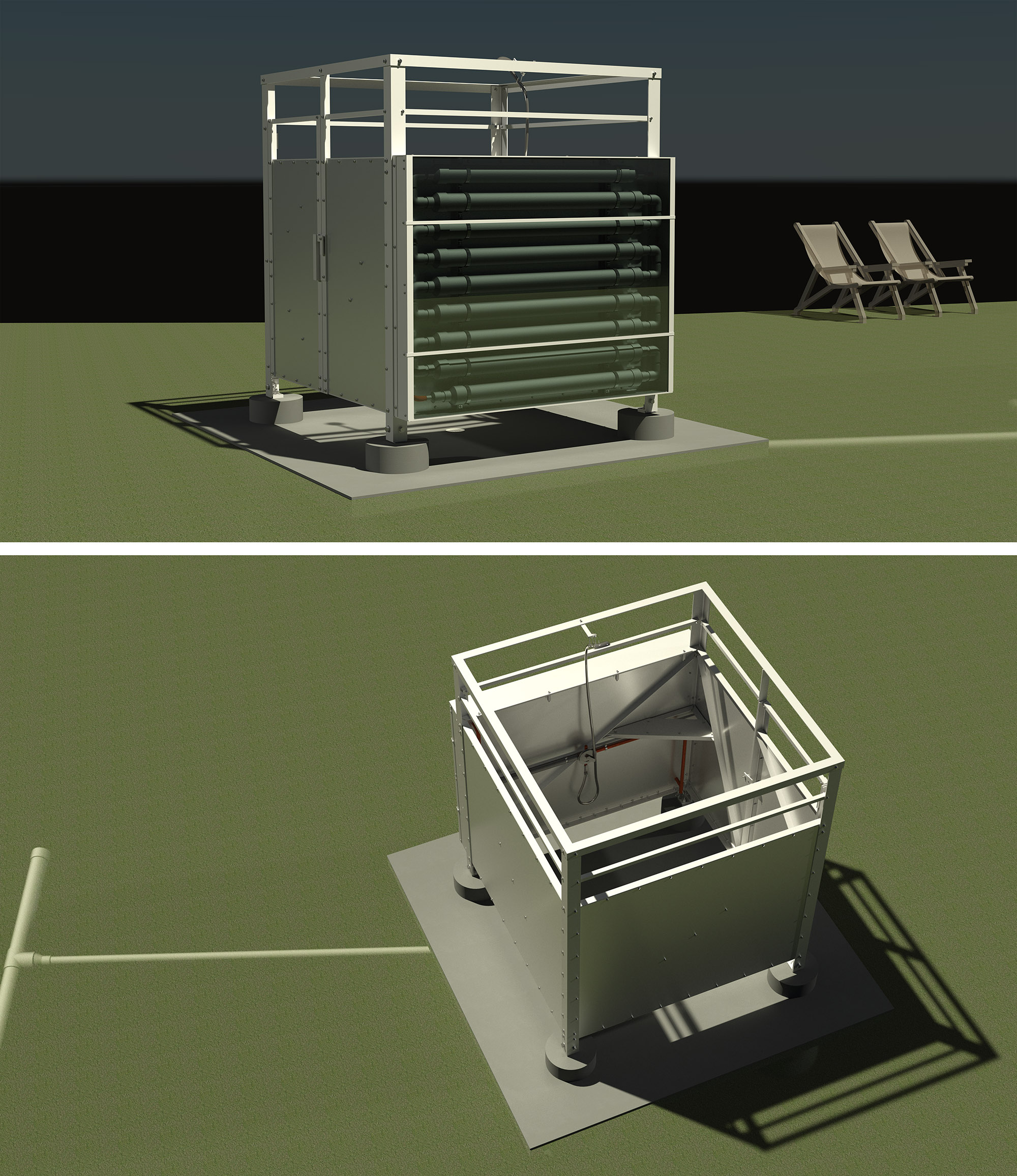 Integral part of a spacious, all-aluminum enclosure, the collector features an increased depth and larger diameter, high-temp pvc tubing to mitigate its limited area and sun angle. It yields a single-use showering capacity, with a 30-minute estimated recovery in full summer sun. Adjustable top vent; upgradeable to copper tubing for hot climates; cold water supply hose hook-up.2020